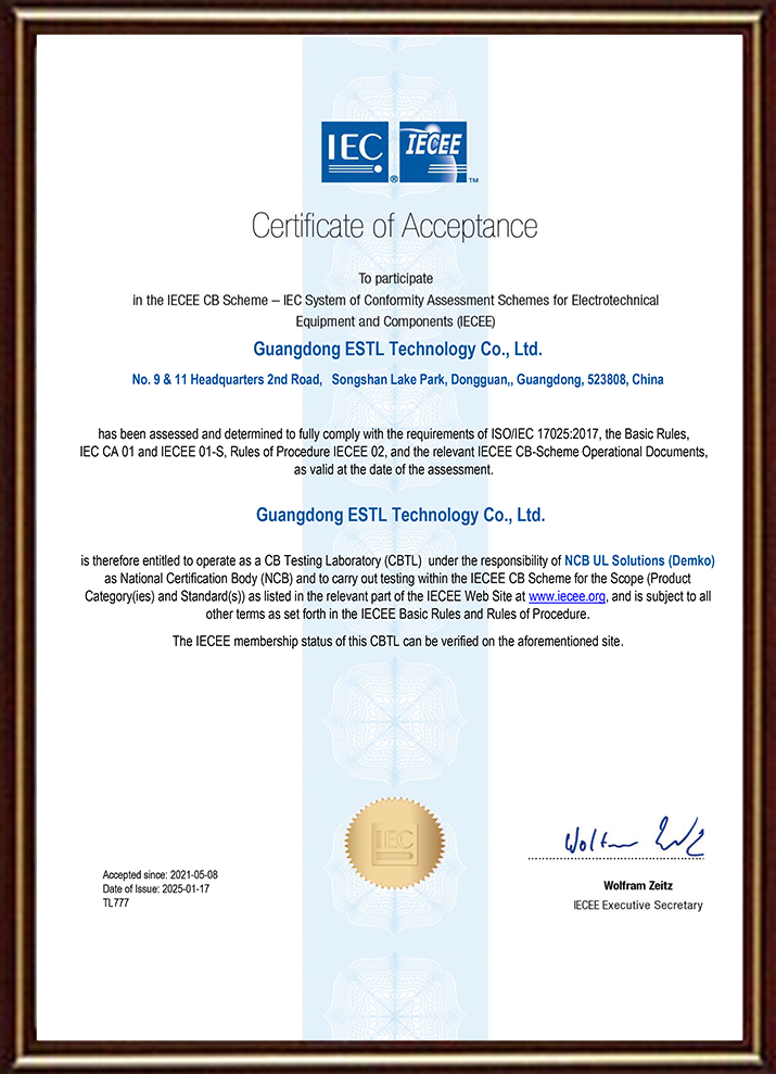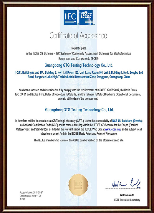 IECEE CB 제도 - 전기 기술 장비 및 부품에 대한 IEC 적합성 평가 체계(IECEE)에 참여하기 위해 회사는 ISO/IEC 17025:2017, 기본 규칙, IEC CA의 요구 사항을 완전히 준수하는 것으로 평가 및 결정되었습니다. 01 및 IECEE 01-S, 절차 규칙 IECEE 02 및 관련 IECEE CB 제도 운영 문서(평가 날짜에 유효함).