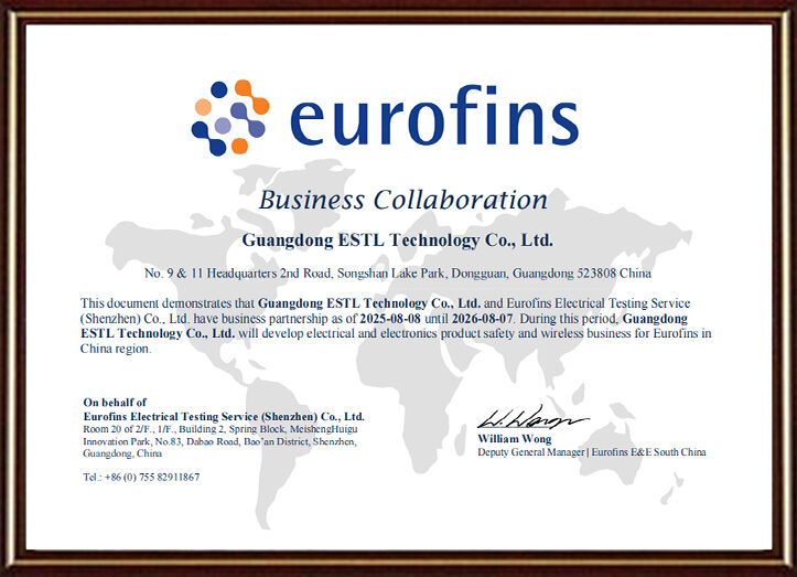 이 인증서는 회사가 중국 지역에서 Eurofins 전기 및 전자 제품 안전 인증 및 무선 규정 준수 승인을 위한 사업 개발을 수행하겠다는 의지를 입증했음을 인정합니다.