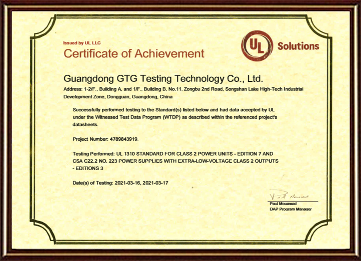 4789843919 - 표준: 클래스 2 전원 장치용 UL 1310 표준 - Edition 7 및 CSA C22.2 NO.223 초저전압 클래스 2 출력이 있는 전원 공급 장치 - Edition 3 - 테스트 날짜: 2021-03-16, 2021 -03-17.