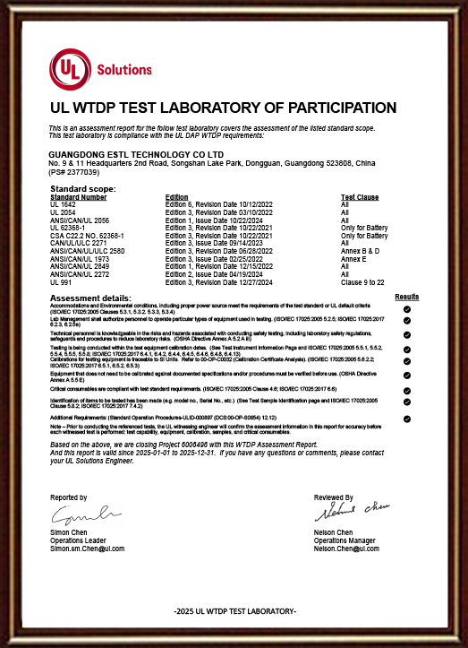2019년에 설립된 ETSL은 중국에 본사를 둔 선도적인 리튬 배터리, 전기 자전거, 전기 스쿠터 테스트 및 인증 회사입니다. 회사는 제품이 안전하고 신뢰할 수 있는 사용에 필요한 표준 및 규정을 충족하는지 확인하기 위해 광범위한 서비스를 제공합니다. 수년간의 경험과 전문가 팀을 통해 회사는 리튬 배터리, 전기 자전거 및 전기 스쿠터를 테스트하고 인증하려는 많은 기업 및 산업에서 신뢰할 수 있는 파트너로 자리매김했습니다.