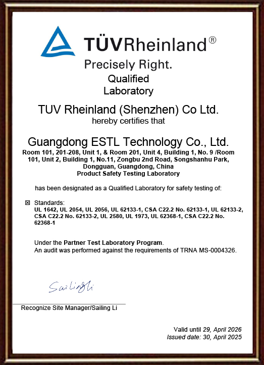 표준: UL1642, UL2054, UL2056, UL62133-1, CSAC22.2No.62133-1, UL62133-2, CSAC22.2No.62133-2, UL2580, UL1973, UL62368-1, CSA C22.2 No.62368-1