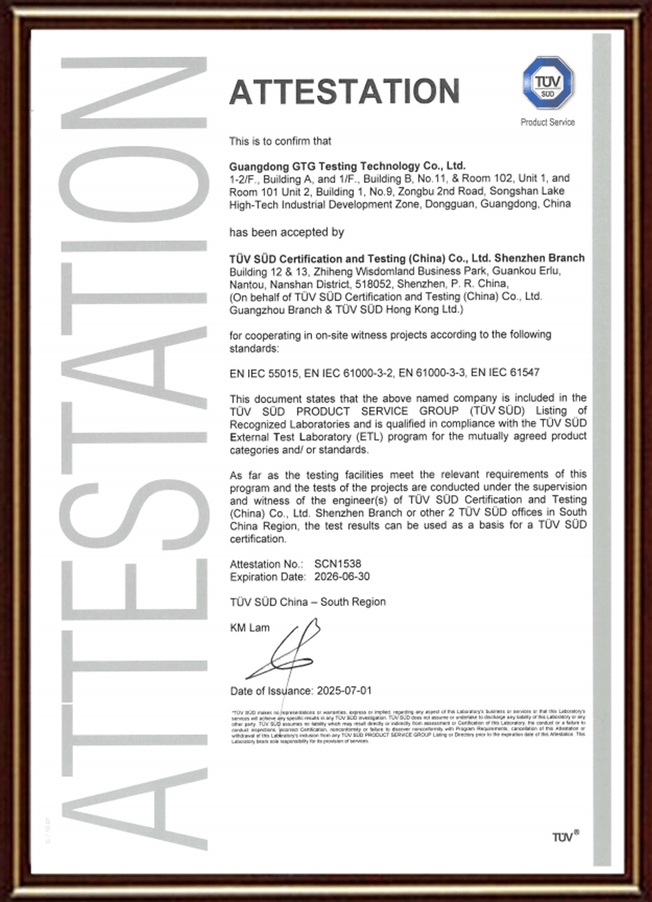 이 문서는 위에 명시된 회사가 TÜV SÜD PRODUCT SERVICE GROUP (TÜV SÜD) 인정 시험소 목록에 포함되어 있으며 상호 합의된 제품 범주 및/또는 표준. 테스트 시설이 이 프로그램의 관련 요구 사항을 충족하고 프로젝트 테스트는 TÜV SÜD Certification and Testing (China) Co., Ltd. 심천 지점 또는 기타 엔지니어의 감독 및 입회 하에 수행됩니다. 중국 남부 지역에 있는 2개의 TÜV SÜD 사무소에서 테스트 결과는 TÜV SÜD 인증의 기초로 사용될 수 있습니다.